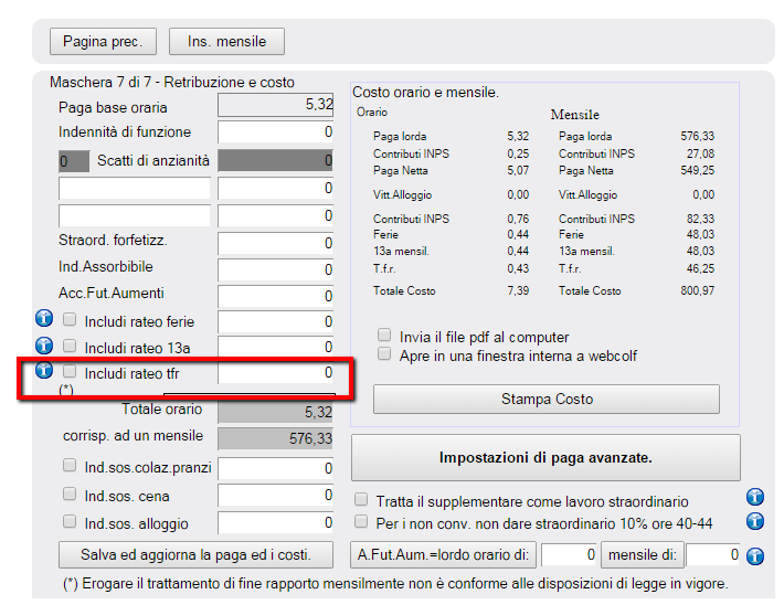 entri in assunzione | dati collaboratore | trattamento economico e controlli di non avere il flag su includi in 'paga oraria tfr,