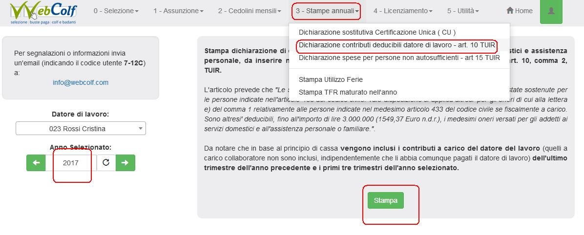 Webcolf prevede la stampa della dichiarazione oneri deducibili per il datore di lavoro (vedi immagine in calce), in cui si attesta il totale dei contributi versati, suddivisi per i vari trimestri e calcolati scorporando tale quota a carico del datore da quella totale di contributi dovuti.