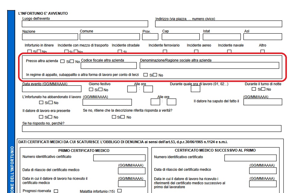 Il modulo da compilare per la denuncia è lo stesso ma alla pagina 3, nella sezione "L'INFORTUNIO E' AVVENUTO", é necessario compilare la parte "Presso altra azienda" indicando i dati del datore di lavoro presso cui è avvenuto l'infortunio.