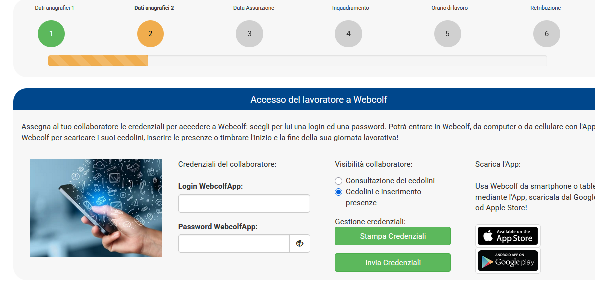 Nel menù Assunzione | inserimento collaboratore | dati anagrafici 2 si possono integrare le credenziali del collaboratore domestico per l'app mobile di Webcolf e le modalità di utilizzo della stessa. In base alla scelta effettuata dal datore, la colf o badante potrà solo consultare il cedolino oppure anche inserire le presenze mensili ogni mese.