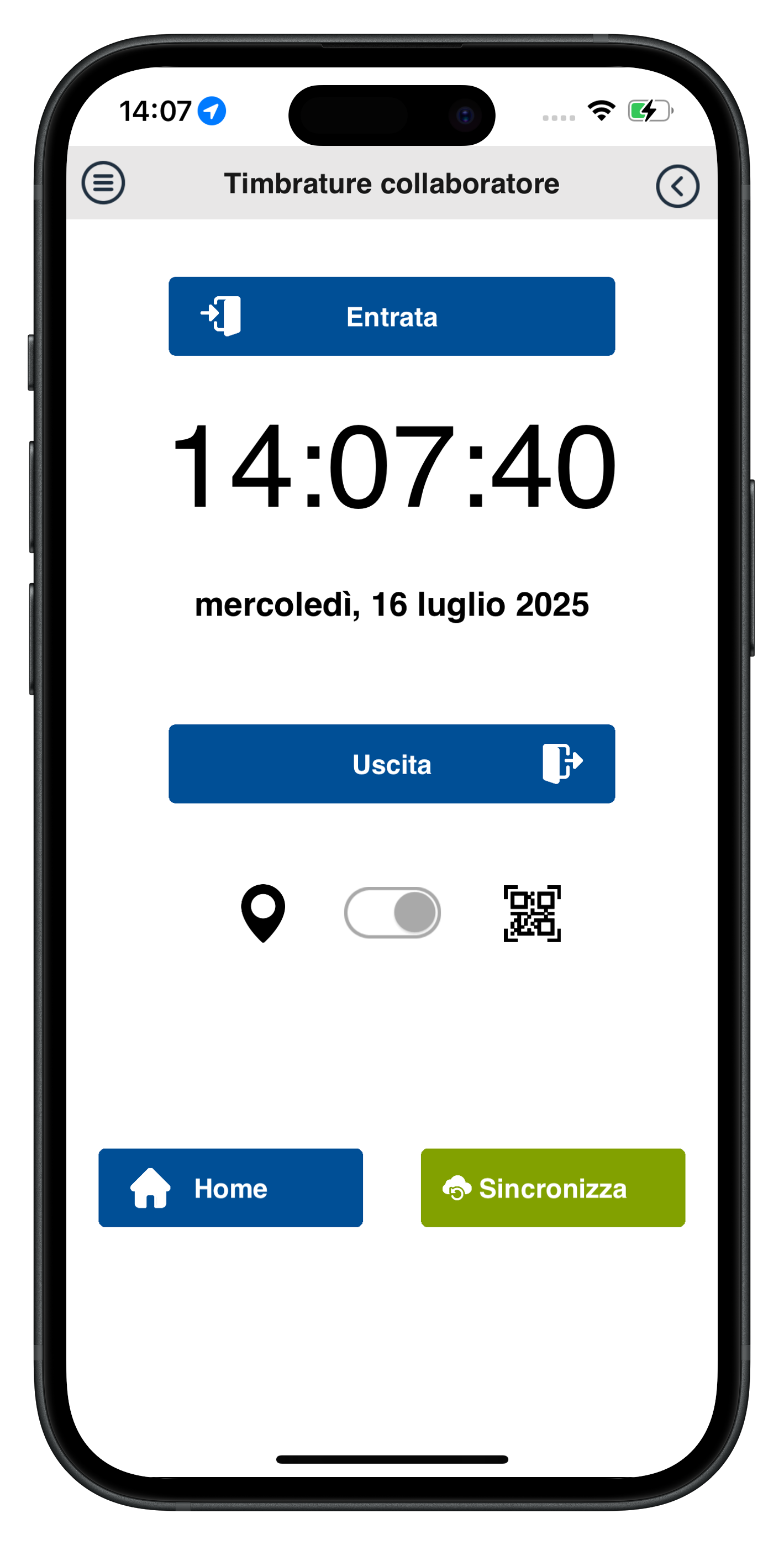 I passaggi iniziali sono a questo punto terminati e il collaboratore può quindi iniziare ad effettuare la rilevazione delle entrate e delle uscite dal lavoro mediante l'App, selezionando il bottone "Timbrature" che compare anche subito all'apertura, decidendo se preferisce utilizzare il QRCode o il posizionamento mediante GPS e poi premendo il bottone "entrata" o "uscita" ( fig. 6 ; fig. 7; fig. 8 ).