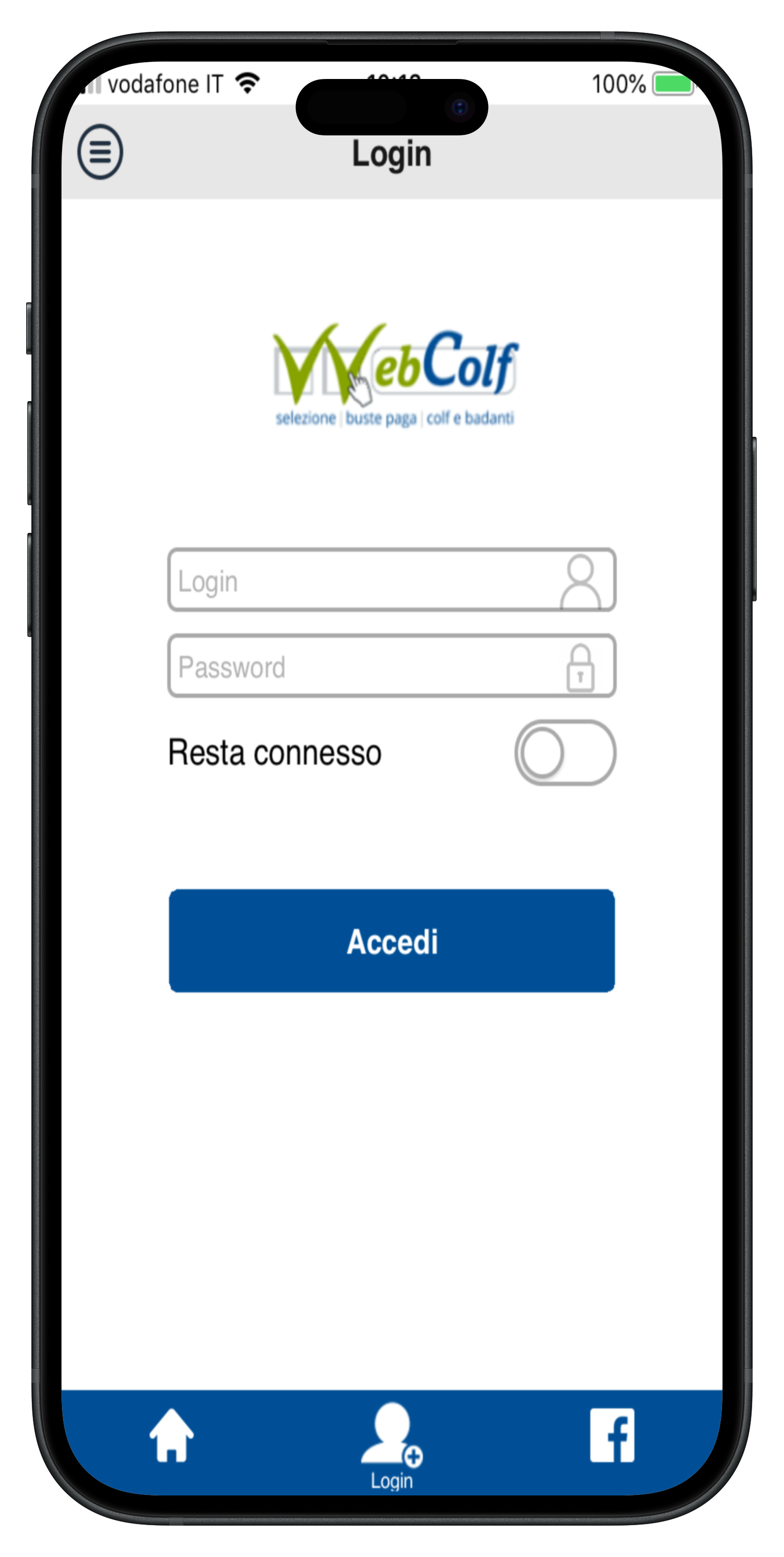 4. Il collaboratore a questo punto, se non l'ha già fatto, dovrebbe scaricare l'app di Webcolf, inserire le credenziali assegnate dal datore ( come specificato sopra al punto 1 ) e fare un primo accesso con login e password, meglio se memorizzando le credenziali (in questo modo il sistema sincronizza in automatico le timbrature di entrata e di uscita una volta effettuate) ( fig. 5 ).