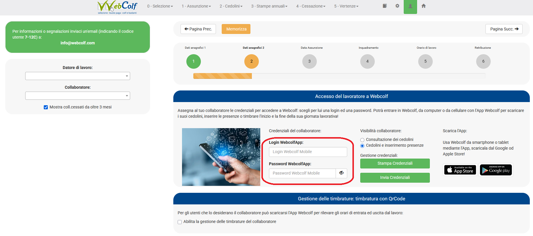 1. L'operazione preliminare a tutti i passaggi consiste nell'assegnazione delle credenziali al proprio collaboratore domestico. A partire dal menu Assunzione | Inserimento collaboratore | App e gestione delle timbrature è necessario compilare i due campi login e password ricordandosi sempre di memorizzare mediate il tab in alto ( fig. 1 ).