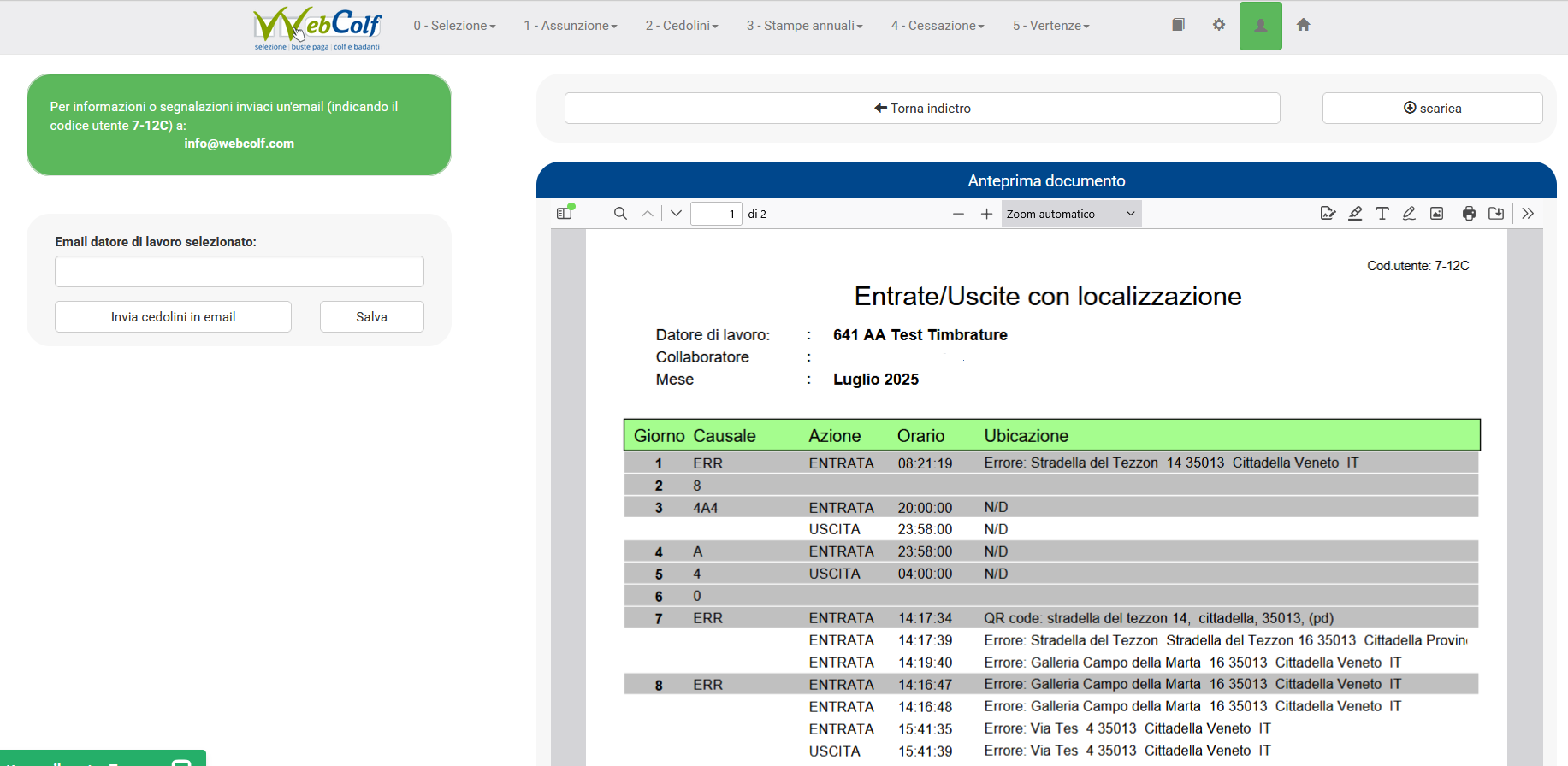 Nel caso in cui da calendario per qualche giornata compaia la voce 'error' significa che è presente un'unica timbratura ( di sola entrata o uscita ).