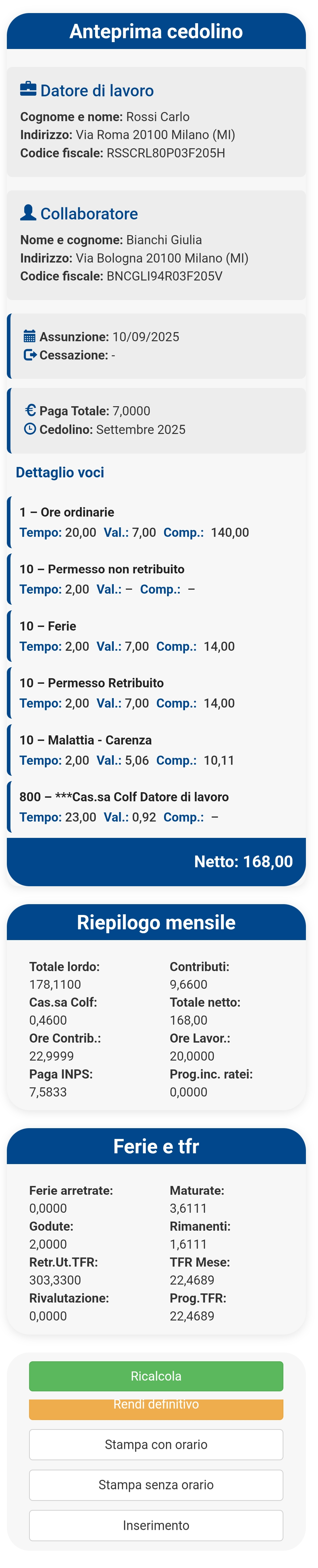 In calce l'utente troverà i tab utili per memorizzare come sempre il cedolino, renderlo definitivo e infine stamparlo con o senza orario.